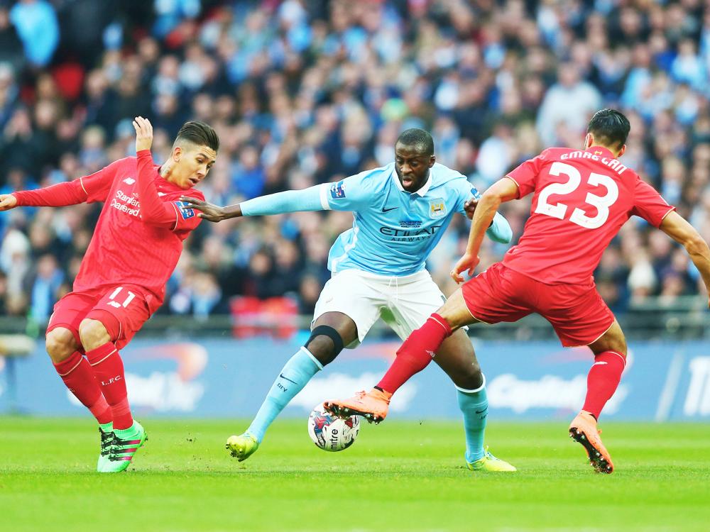 توريه محاصر بين إثنين من لاعبي ليفربول.