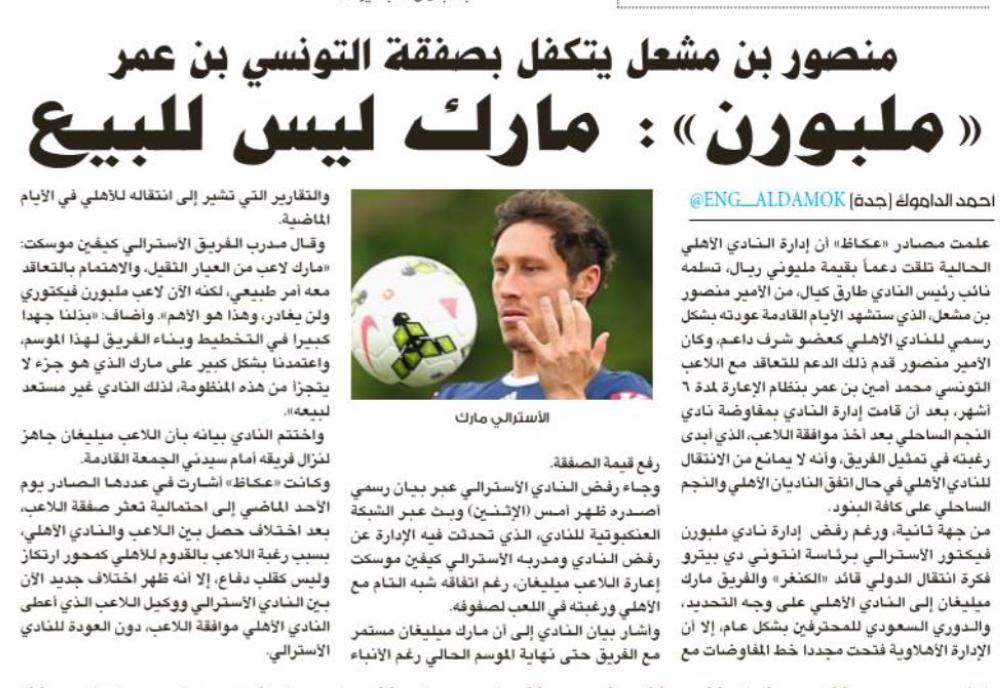 علمت مصادر «عكاظ» أن إدارة النادي الأهلي منحت اللاعب الأسترالي مارك ميليغان لاعب ملبورن فيكتوري الأسترالي مهلة أخيرة حتى مساء اليوم (الأربعاء) للرد على العرض المقدم مجدداً بقيمة 700 ألف دولار للاعب وللنادي، بعد رفضه العرض السابق بقيمة 400 ألف دولار. وتشير المصادر إلى أن إدارة النادي لديها الملفات البديلة في حال تعثر انتقال ميليغان، من أجل الاستعداد للمنافسات المحلية والقارية، وإغلاق ملفات اللاعبين الأجانب في غضون الأيام القادمة، قبل إغلاق فترة الانتقالات الشتوية.