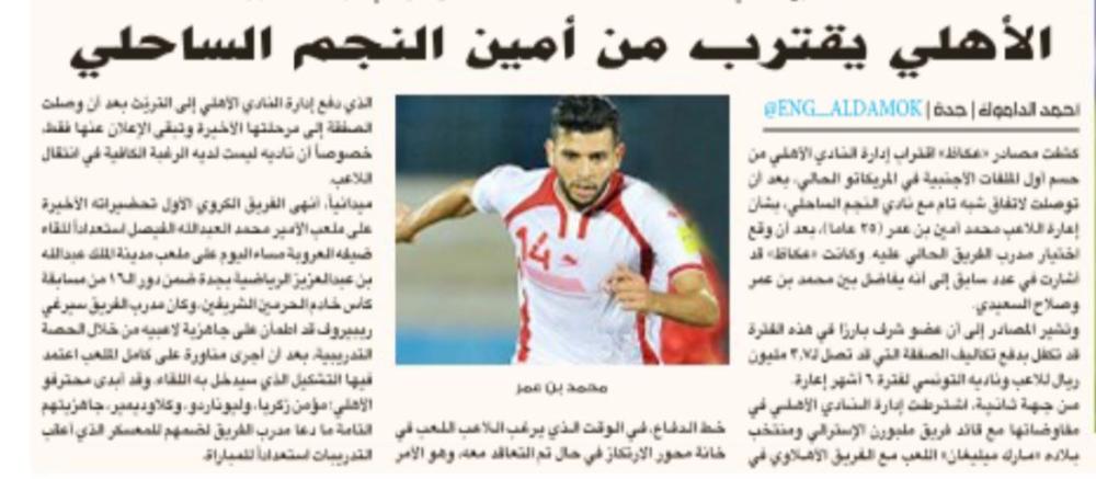 في ما يخص اللاعب التونسي محمد أمين بن عمر، فكما أشارت «عكاظ» في وقت سابق إلى تفضيله على اللاعب المغربي صلاح السعيدي، ومن ثم تقديم العرض الرسمي للاعب الذي أبدى موافقته لتتبقى موافقة ناديه النجم الساحلي، الذي تلقى العرض الرسمي والسماح للاعب بالانتقال لفترة 6 أشهر للفريق الأخضر. وأكدت مصادر «عكاظ» أن بن عمر يبدي رغبة شديدة في الانتقال وتمثيل الأهلي في الفترة القادمة، وطلب من إدارة ناديه اجتماعاً لتحديد مصيره، ومن المنتظر أن تنتهي القصة خلال الساعات القادمة.