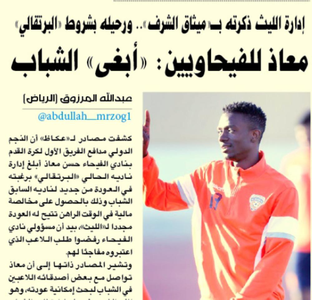 صادقت إدارتا «الشباب والفيحاء» على الخبر المنشور عبر «عكاظ» الثلاثاء الماضي الذي تضمن حديثاً جمع النجم الدولي حسن معاذ مع إدارة فريقه الفيحاء لأجل الانتقال على سبيل الإعارة لناديه السابق الشباب لمدة 6 أشهر، وكان عنوان الخبر المنشور «معاذ للفيحاويين: أبغى الشباب».