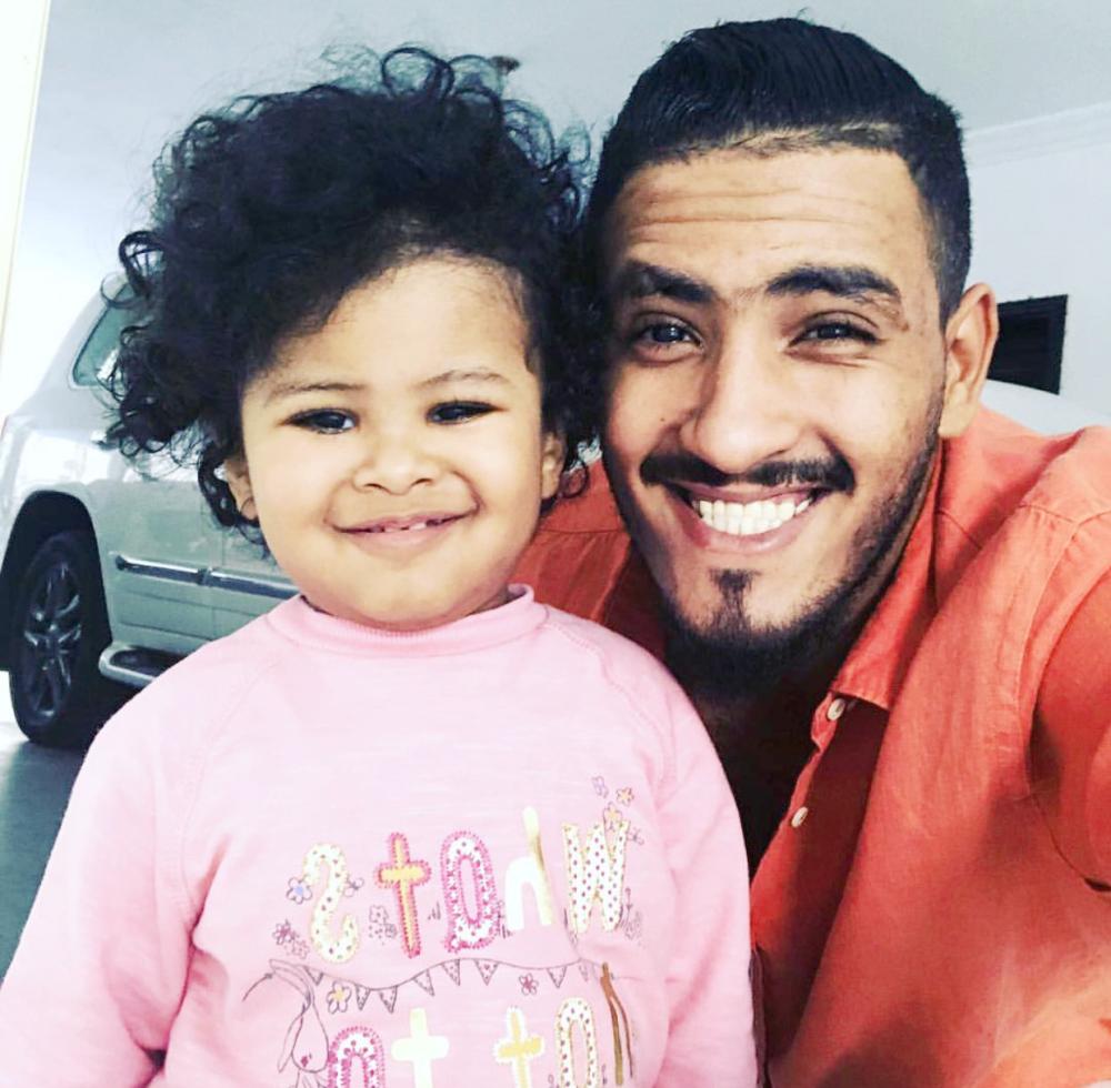 فواز القرني برفقة طفلته في النادي أمس. (عكاظ)