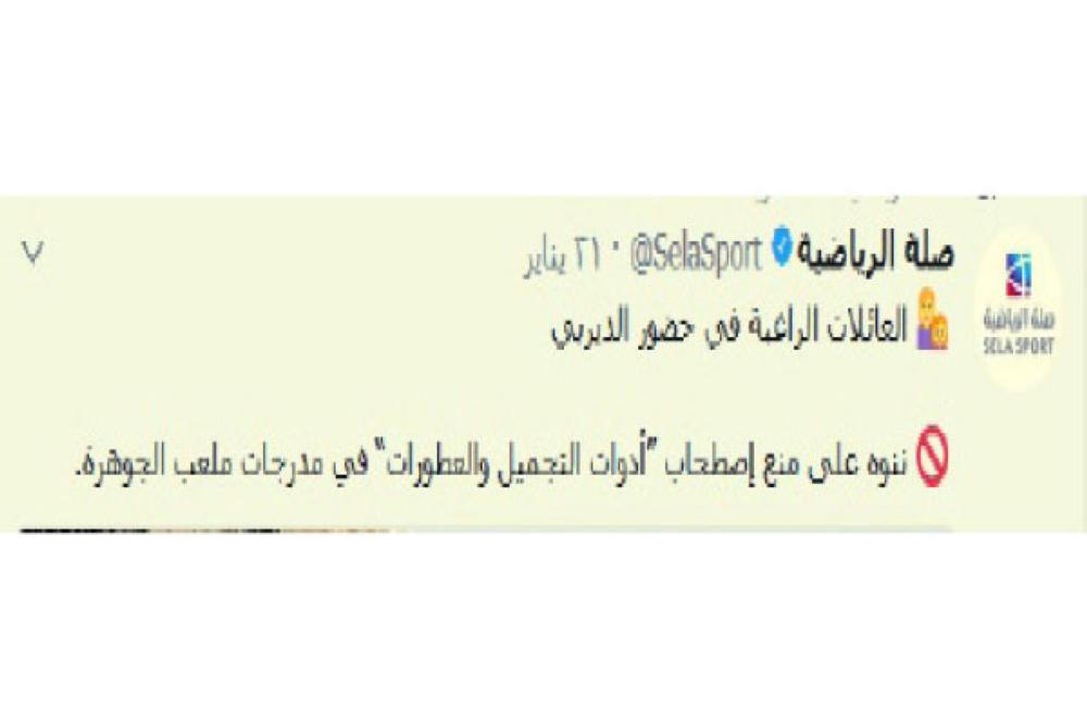 وجاء ذلك خلال بث الحساب الرسمي لصلة الرياضية عبر موقع التواصل الاجتماعي «تويتر» تغريدة، نصها كالتالي: «العائلات الراغبة في حضور الديربي.. ننوه على منع اصطحاب «أدوات التجميل والعطورات» في مدرجات ملعب الجوهرة».