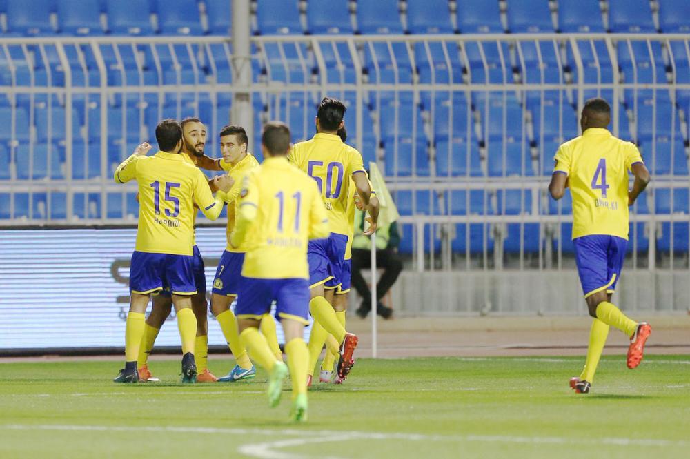فرحة لاعبي النصر بهدف السهلاوي في مرمى أحد.