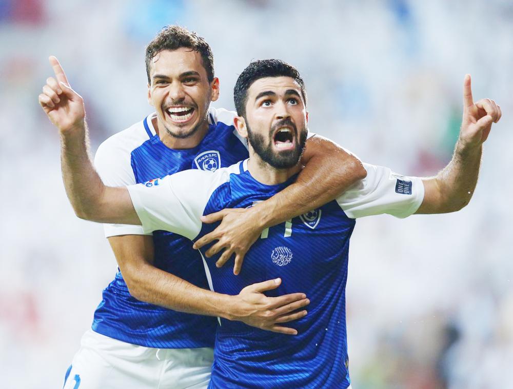 نجمي الهلال عمر خربين كارلوس وإدواردو في فرحة سابقة.
