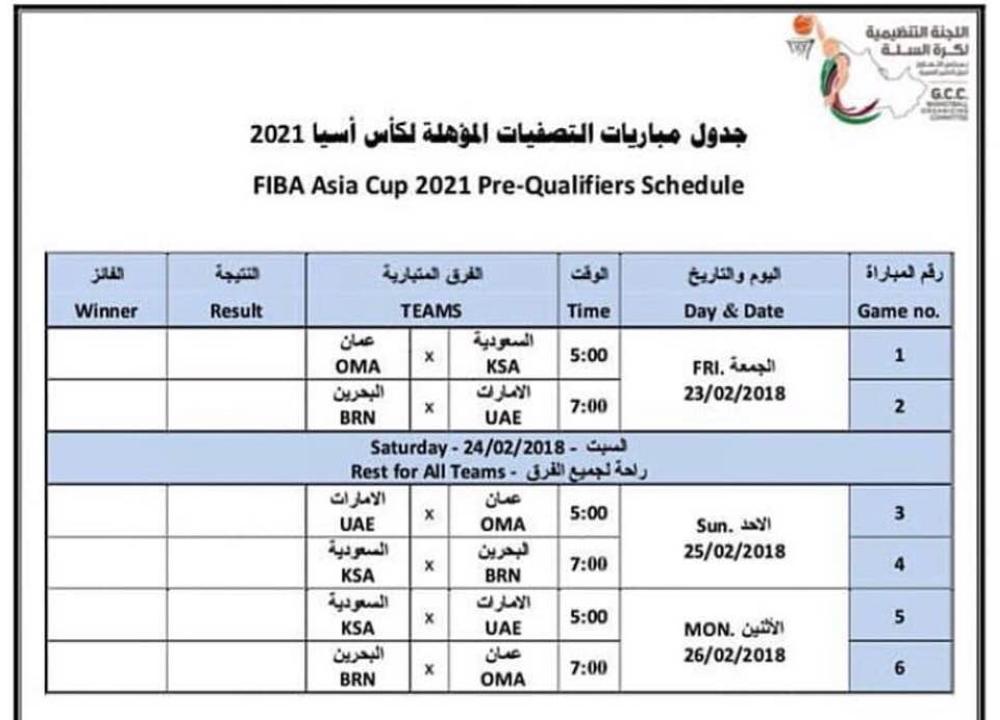 اعلن الاتحاد الآسيوي لكرة السلة جدول تصفيات البطولة الآسيوية التي تستضيفها مملكة البحرين يوم (الجمعة) القادم، بمشاركة اربعة منتخبات خليجية ( السعودية / البحرين/ الامارات / عمان) وسيلعب منتخبنا اولي مبارياته يوم (الجمعة) القادم مع عمان، فيما يلعب لقاء الثاني مع البحرين يوم (الأحد) ويلعب يوم (الاثنين) في ختام البطولة مع الامارات.