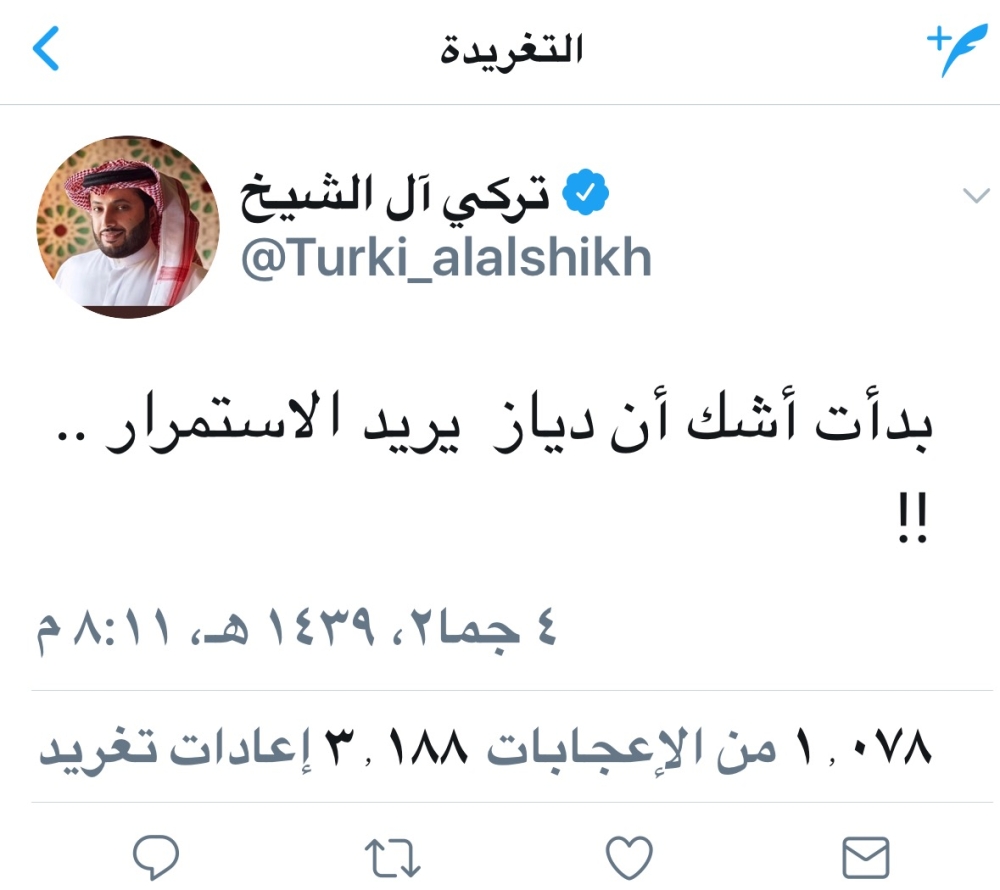 وجاءت تغريدة آل الشيخ عقب المباراة على حسابه في تويتر، في وقت تفاعلت الجماهير الهلالية مع الخسارة غير المتوقعة للفريق، مطالبة إدارة النادي بالتدخل لمناقشة المدرب في أخطائه التي تجلت بوضوح عقب كل مباراة.
