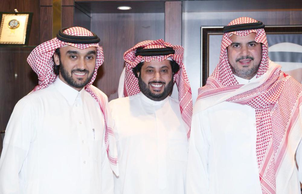 تركي آل الشيخ يتوسط الأميرين عبدالحكيم بن مساعد وعبدالعزيز بن تركي الفيصل.
