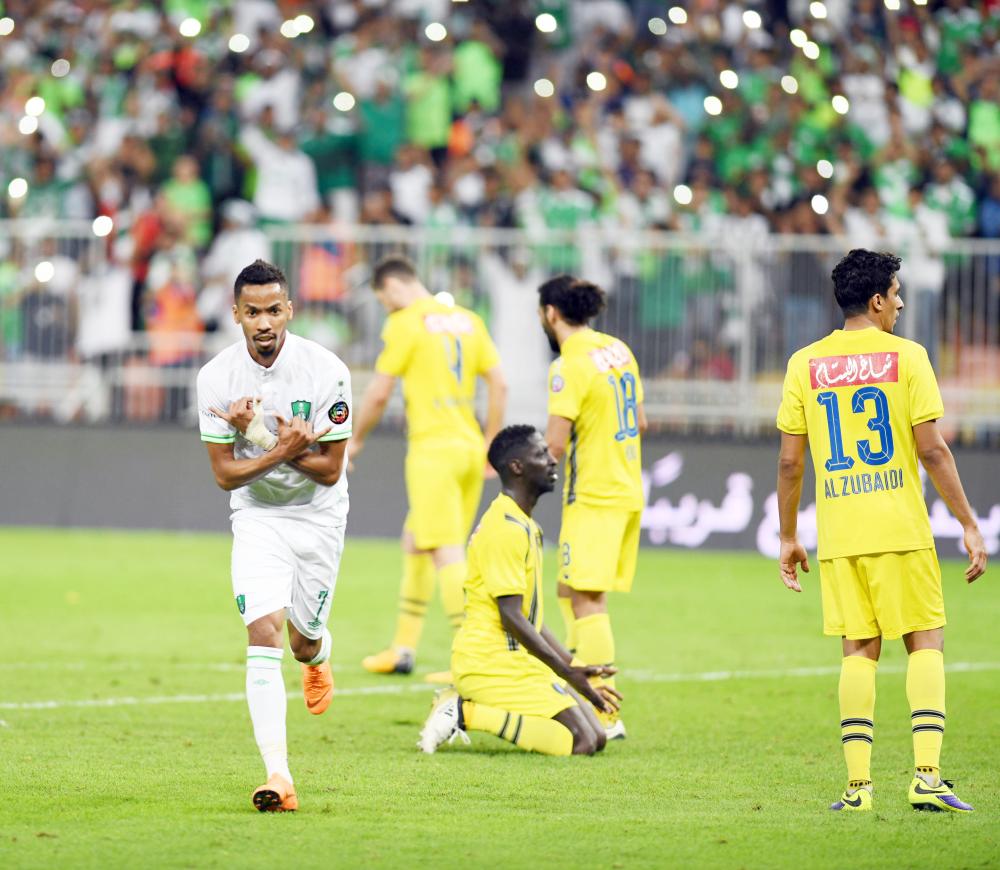 المؤشر يحتفل بأحد أهداف الأهلي الخمسة في مرمى التعاون. (عكاظ)