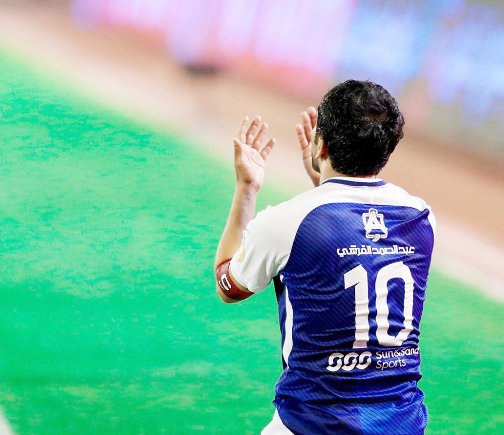 الشلهوب رافعاً يديه بعد تسجيله هدف الفوز لفريقه أمام القادسية.