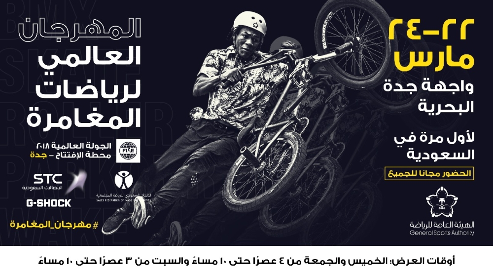 تنظم الهيئة العامة للرياضة، المهرجان العالمي لرياضات المغامرة، بتوجيه من رئيس مجلس إدارة الهيئة رئيس اللجنة الأولمبية العربية السعودية تركي آل الشيخ، بوصفه أحد الأحداث الرياضية النوعية لنشر ثقافة الألعاب الرياضية المختلفة، وزيادة الإقبال على ممارسة الرياضات المتنوعة، وذلك في ظل سعي الهيئة إلى صناعة رياضة جاذبة ومشوقة، تحفز المجتمع على ممارسة الرياضة بكافة أشكالها وأنواعها. وسينطلق المهرجان الخميس القادم، ويستمر يومين خلال الفترة من 5 - 7 رجب 1439 في الواجهة البحرية في مدينة جدة، حيث سيقام المهرجان لأول مرة في السعودية، وسيكون حضور الجماهير مجانًا.