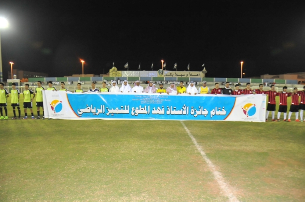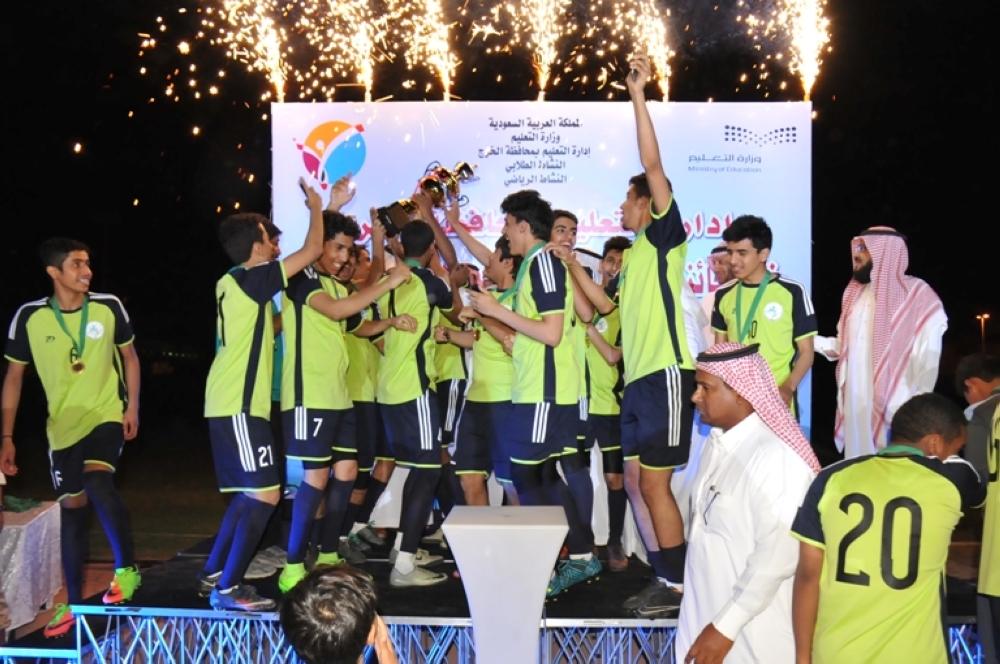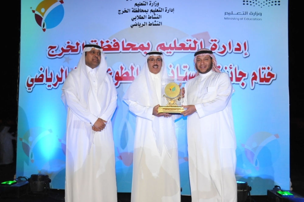 رعى الحفلة الختامية مدير تعليم الخرج الدكتور عبدالرحمن العبدالجبار حيث استقبل راعي الجائزة فهد المطوع بحضور مساعد مدير تعليم الخرج للشؤون التعليمية خالد الحربي ورؤساء الأقسام والشعب وعدد من قادة المدارس بالمحافظة، وقاد المباراة الختامية الحكم الدولي السابق مطرف القحطاني.