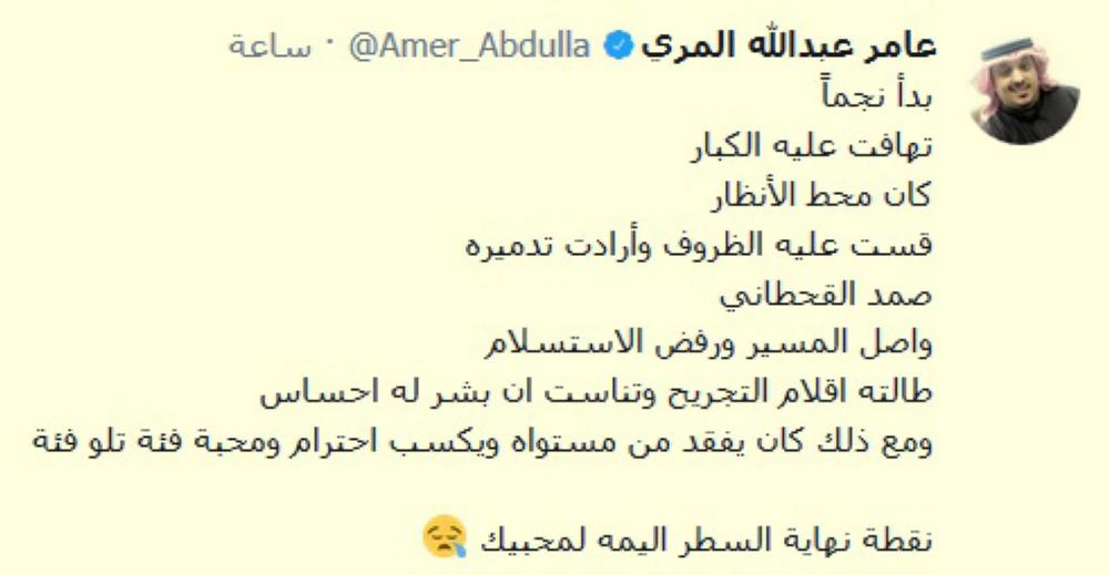 عامر عبدالله: «بدأ نجماً، تهافت عليه الكبار، كان محط الأنظار (...) نقطة نهاية السطر أليمة لمحبيك».
