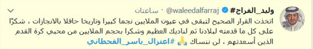 وليد الفراج: «اتخذت القرار الصحيح لتبقى في عيون الملايين نجماً كبيراً وتاريخاً حافلاً بالإنجازات».