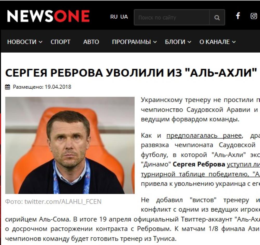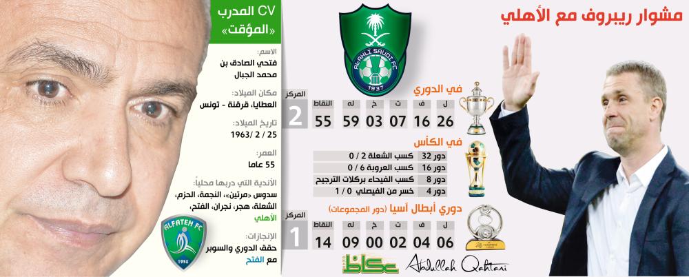 وكانت إدارة «الراقي» أصدرت بياناً أمس بث عبر الحساب على «تويتر» جاء نصه: قررت إدارة النادي الأهلي إلغاء عقد مدرب الفريق الأول لكرة القدم الأوكراني سيرغي ريبروف، وقامت بتكليف المدرب التونسي القدير فتحي الجبال لقيادة الفريق في مواجهتي «الذهاب والإياب» من دور الـ16 في دوري أبطال آسيا.