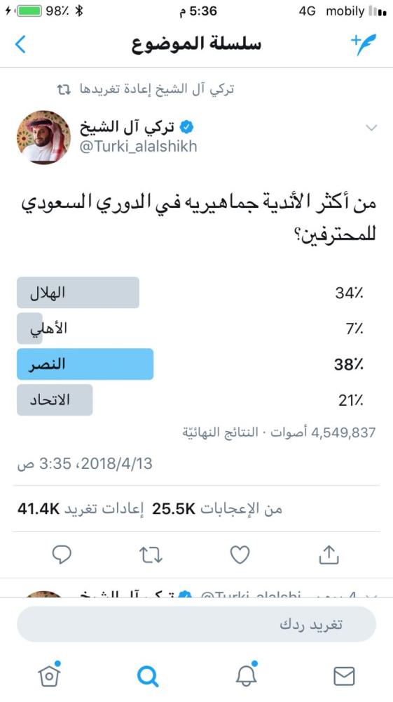 تصدر نادي النصر الاستفتاء الجماهيري الذي أطلقه رئيس هيئة الرياضة تركي آل الشيخ عبر حسابه الشخصي في «تويتر»، واقتصر على الأندية الجماهيرية الـ4: النصر، والهلال، والاتحاد، والأهلي.