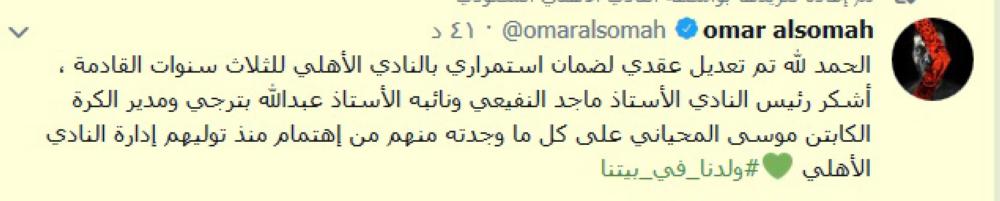 وقدم رئيس النادي ماجد النفيعي شكره وتقديره لرئيس الهيئة العامة للرياضة تركي آل الشيخ على تكفله بسداد كامل مستحقات الكابتن عمر السومة، وعلى دعمه المتواصل واللامحدود للنادي الأهلي، ولكافة أندية الوطن دون استثناء، متمنياً أن يساهم السومة مع زملائه اللاعبين في تحقيق البطولات وحصد المنجزات لإسعاد جماهير الأهلي الوفية.