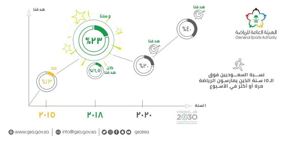 وأضاف: «خلال الربع الأول من عام 2018 تم إجراء استبيان وطني آخر للرياضة وتنفيذه بذات الآلية، إذ أظهرت النتائج أن المواطنين السعوديين أصبحوا يمارسون الرياضة بشكل أكبر من عام 2015 حيث ارتفعت نسبة ممارسي الرياضة بصفة دورية من 13% إلى 23%، وبذلك حققت الهيئة العامة للرياضة مستهدفات عام 2020 التي كانت محددة بنسبة 20%».