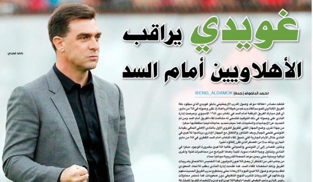 صادقت إدارة النادي الأهلي على خبر «عكاظ» المنشور يوم الأربعاء الماضي (رقم 18876)، الموافق 2 مايو 2018، الذي حمل عنوان «غويدي يراقب الأهلاويين أمام السد»، إضافة إلى موعد وصوله اليوم (الأحد) 6 مايو.