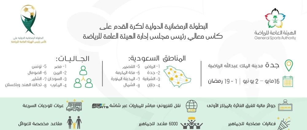 تنطلق غدًا (الأربعاء)، منافسات البطولة الرمضانية الدولية لكرة القدم على كأس رئيس الهيئة العامة للرياضة وتستمر حتى يوم 17 رمضان القادم، التي ستُقام على الملعب الرئيسي الرديف في مدينة الملك عبد الله الرياضية بمحافظة جدة.