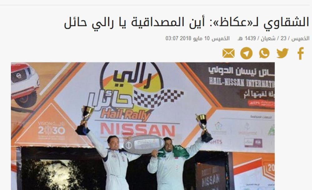 عقبت اللجنة العليا المنظمة لرالي حائل على الخبر المنشور في صحيفة «عكاظ» يوم الخميس 24 شعبان 1439 الموافق 10 مايو 2018، في عدد رقم 18884، تحت عنوان «الشقاوي لعكاظ: أين المصداقية يا رالي حائل»، وأبدت في ردها، استغرابها مما تضمنه الخبر الذي نشره الصحفي إبراهيم الشمسان، وقالت: ما نقله الخبر من تصريح صحفي عن المتسابق أحمد الشقاوي الفائز بالمركز الأول في فئة (T2) من عدم استلام جائزته، وما ذكره الشقاوي (على حد قوله وفقاً للخبر المنشور) من أنه هو وزميله عيسى الدوسري الفائز بالمركز الأول في فئة (T1) من الشركة الراعية لسباق رالي حائل نيسان الدولي 2018، حتى الآن؛ تود اللجنة المنظمة أن تؤكد أن الرالي يقدم سنويا جوائز مجزية مقارنة بالراليات الأخرى، كما أن المتسابقين أحمد الشقاوي وعيسى الدوسري يستحقان هذه الجائزة التي سبق أن أعلنتها اللجنة العليا المنظمة للرالي انطلاقا من حرص اللجنة على أن تُسلم الجوائز فور انتهاء السباق من خلال طلب بيانات الفائزين وإيداع جوائزهم النقدية، إذ تم فور انتهاء السباق طلب بيانات الفائزين من الاتحاد السعودي للسيارات والدراجات النارية، كما جرت العادة، وتم تسليم الجوائز المالية الأخرى التي تمنحها اللجنة العليا المنظمة لرالي حائل لتشمل الجوائز أكبر عدد من المتسابقين للفئات المختلفة التي تشارك بالرالي، وذلك بتوجيه مباشر من أمير منطقة حائل رئيس الهيئة العليا لتطوير المنطقة رئيس اللجنة العليا المنظمة للرالي، وبمتابعة من مساعد رئيس الهيئة رئيس اللجنة التنفيذية للرالي. وقد تم توجيه السائقين صاحبي الجائزتين العينيتين إلى الراعي الرسمي لاستلام جائزتيهما بموجب تواصل مباشر مع الشركة الراعية لتوفير جائزتيهما حسب نوع السيارة المقدمة المعلن عنها، وترك خيار آخر للمتسابق الأول تعاونا من اللجنة والراعي الرسمي الذي طلب فيه المتسابق رفع نوع السيارة التي يرغبها بموجب التواصل الذي تم بينه وبين الشركة الراعية في هذا الشأن، وبناء على رغبته، ولم يكن هناك أي اعتراض قُدم للشركة الراعية حسب نتائج المتابعة التي تمت مع الراعي الرسمي، عكس ما نقله الصحفي الشمسان على لسان الشقاوي، أما الفائز الأول بفئة T2 فقد كان هناك تواصل مع الشركة وتم تعميد الشركة في حينه لتسليمه جائزته منذ فترة طويلة.