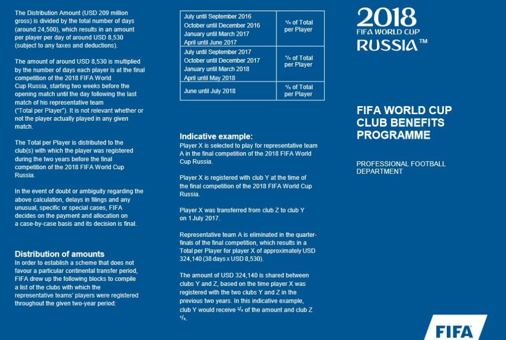 كما أن «FIFA» يقوم بتخصيص مبالغ مالية لكل لاعب، بحيث يكون احتساب الحصة وفق آلية معينة تأخذ بعين الاعتبار عدد لاعبي النادي الذين تم اختيارهم لتمثيل المنتخب في كأس العالم، وكذلك عدد الأيام التي أمضاها كل لاعب في البطولة، بدءا من أسبوعين قبل المباراة الافتتاحية وحتى اليوم الذي يلي إقصاء المنتخب المعني، ومن ثم يتم تقديم حصة للأندية التي كان اللاعب مسجلا فيها رسميا في السنتين اللتين سبقتا اليوم التالي لإقصاء المنتخب المعني من البطولة.
