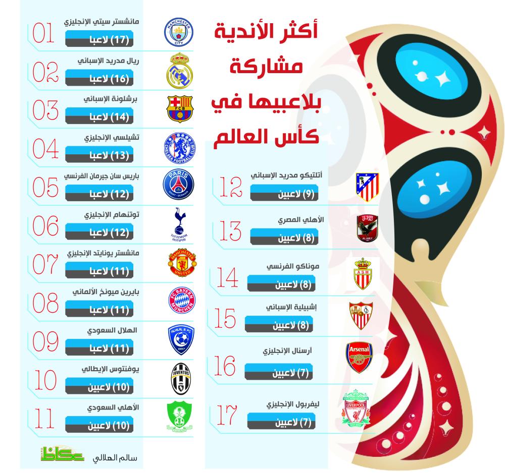 ناديان سعوديان اقتحما قائمة أفضل 10 أندية مشاركة بلاعبيها في مونديال روسيا الذي سينطلق بعد 20 يوما، ما يعكس قوة الدوري السعودي بوجودهما على خريطة أكثر الأندية مشاركة بلاعبيها في كأس العالم.
