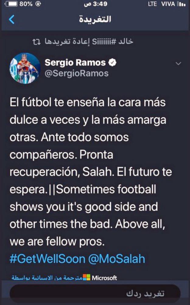 ووجه راموس في تغريدة عبر حسابه في «تويتر» رسالة إلى محمد صلاح، وقال باللغة الإسبانية: «كرة القدم تعطيك وجهها الطيب في أحيان والسيئ في أحيان أخرى. في البداية نحن أبطال أوروبا، محمد صلاح، أتمنى لك الشفاء العاجل فالمستقبل في انتظارك».