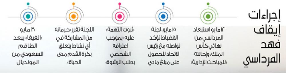 وأشارت إلى أن النادي رفع ما في حوزته من إثباتات، ومنها محادثات عبر تطبيق «واتساب»، إلى السلطات الرياضية السعودية، التي أحالت الحكم إلى المباحث الإدارية للتحقيق معه، ليلي ذلك «ثبوت التهمة» على المرداسي «بموجب اعترافه الشخصي بطلب الرشوة»، وعليه قررت اللجنة «حرمانه من المشاركة في أي نشاط يتعلق بكرة القدم مدى الحياة».