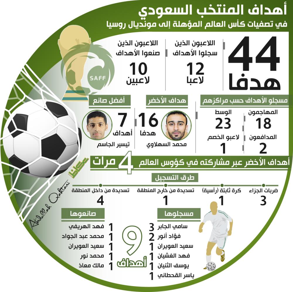 (44) هدفا تناوب على تسجيلها (12) لاعبا سعوديا في (18) مباراة في إجمالي تصفيات كأس العالم عن القارة الآسيوية، أسهمت في وصول الأخضر لمونديال روسيا بعد غياب دام (12) عاما.