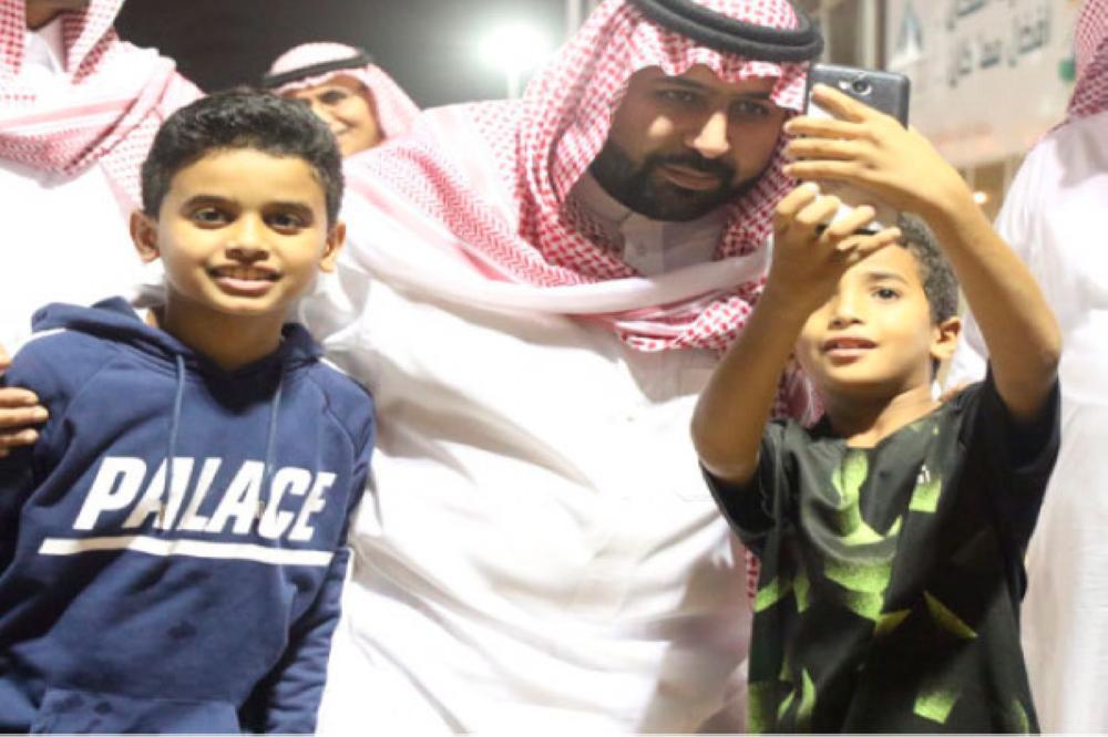 طفلان يلتقطان «سيلفي» مع الأمير محمد بن عبدالعزيز.
