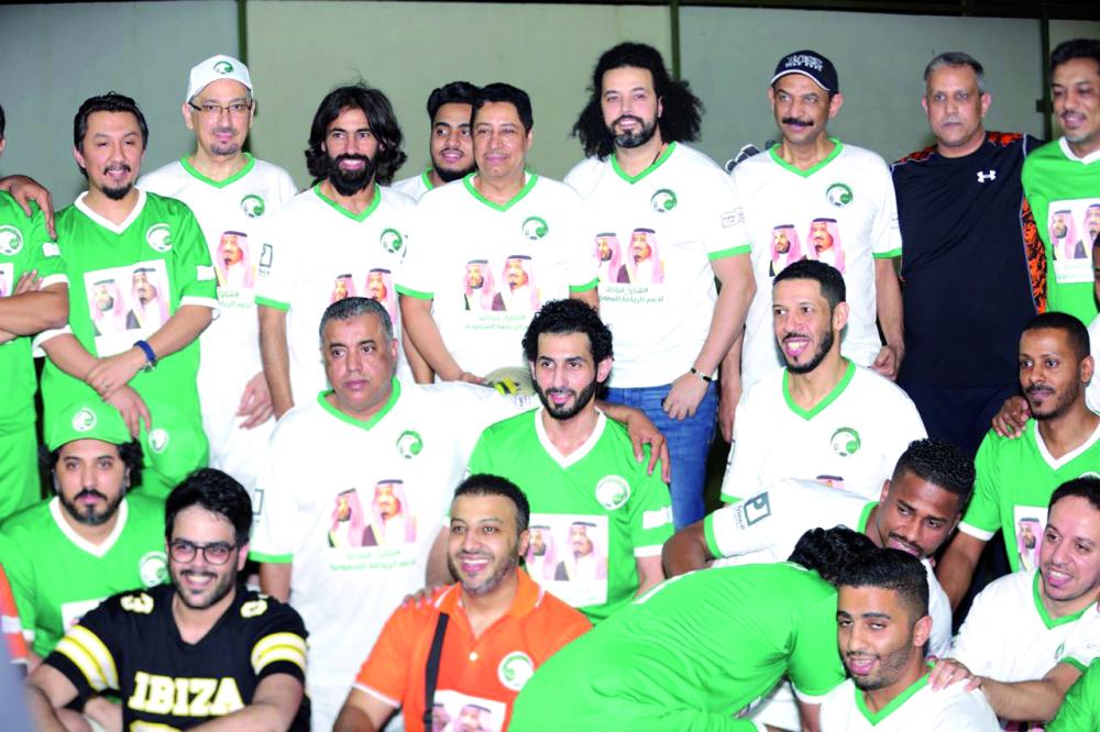 صورة جماعية لنجوم الفن والرياضة قبل مشاركتهم في المباراة الودية. (عكاظ)
