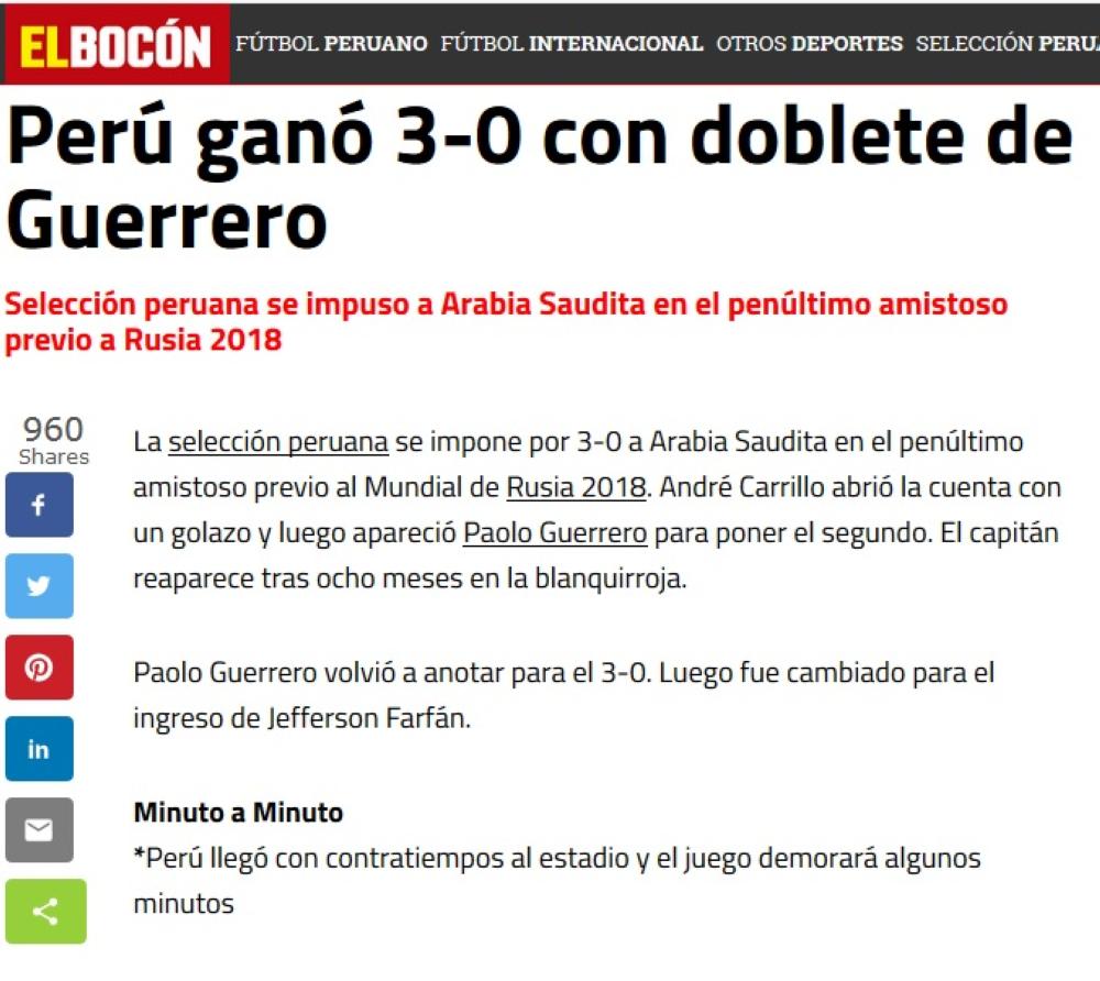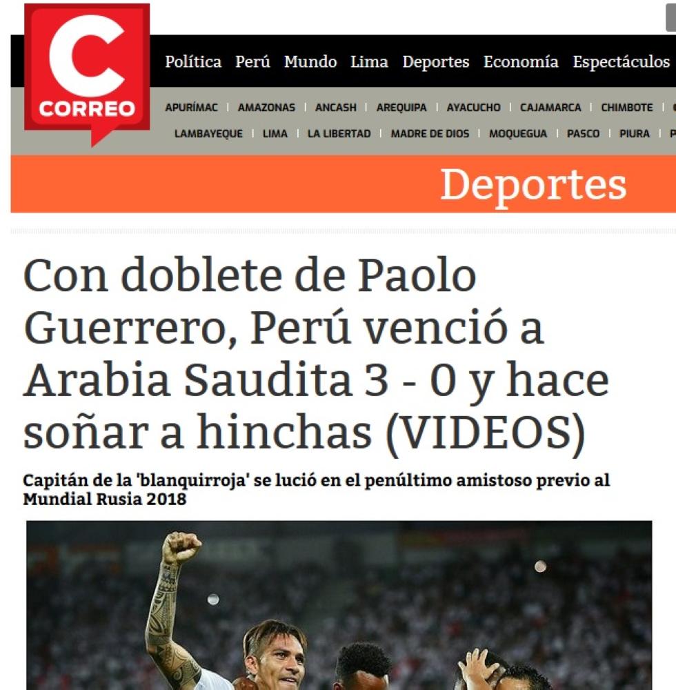 وصف عدد من الصحف البيروفية مواجهة منتخب بلادها أمام الأخضر السعودي بـ«السهلة» وذلك عقب فوزهم بثلاثية دون مقابل خلال اللقاء الودي الدولي قبل الأخير استعداداً لنهائيات مونديال كأس العالم في روسيا 2018، وقالت صحف «diariocorreo- todosport-elbocon» إن لاعبي منتخب بيرو كانوا في الفورمة وقدموا أداء عاليا طيلة مجريات شوطي المباراة، حيث هددوا حارس مرمى السعودية منذ البداية ونجحوا في إحراز هدف التقدم المبكر عند الدقيقة 20، وحافظوا على الأداء الفني العالي مع تطبيق خطة المدرب الأرجنتيني ريكاردو جاريكا التي وضع تكتيكاً أشبه بتطبيقه خلال مباريات مونديال روسيا.