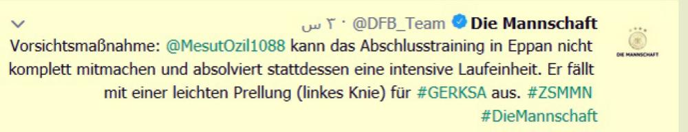 وجاء نص تغريدة الحساب الرسمي للمنتخب الألماني كالتالي: «لم يشارك مسعود أوزيل في المران النهائي. سيغيب عن مواجهة اليوم أمام المنتخب السعودي بسبب كدمة طفيفة في ركبته اليسرى».