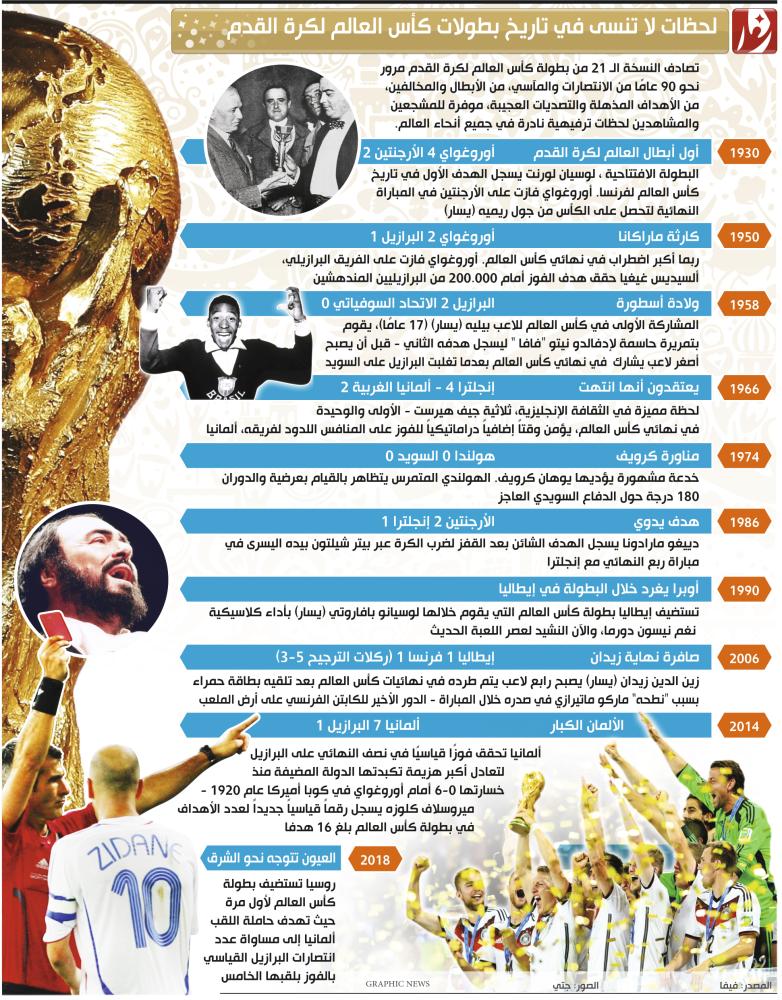 وكانت وكالات الأنباء رصدت لحظات تاريخية في بطولات كأس العالم لكرة القدم بداية من النسخة الأولى عام 1930، وانتهاء بالنسخة العشرين قبل 4 سنوات على الأراضي البرازيلية، في نقاط مختصرة وموجزة.