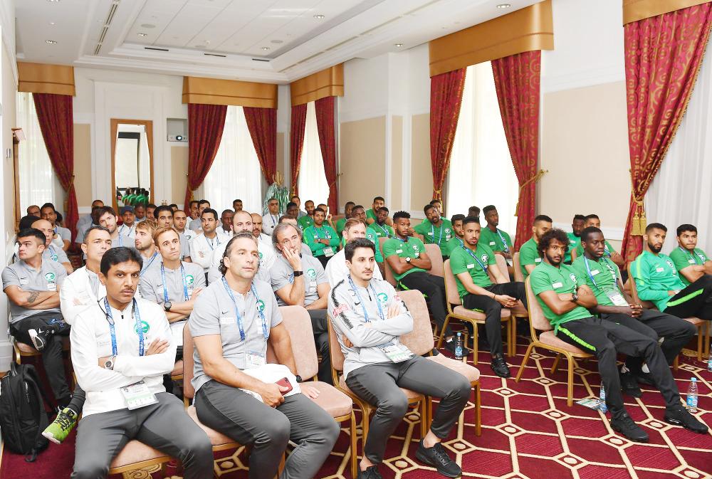 جانب من اجتماع وفد اللجنة المنظمة للمونديال مع بعثة المنتخب السعودي. (عكاظ)