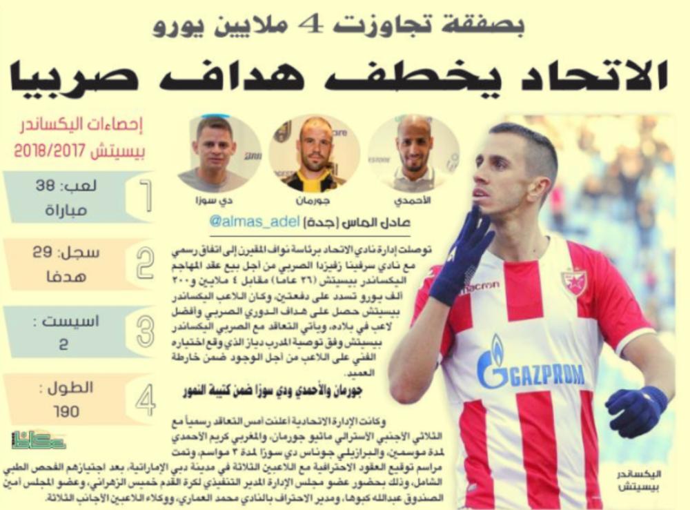 أعلنت إدارة نادي الاتحاد برئاسة نواف المقيرن، التعاقد رسميا مع المهاجم الصربي اليكساندر بيسيتش قادما من نادي سرفينا زفيزدا الصربي، وبذلك يصبح الصربي بيسيتش سابع أجانب العميد إلى جانب الإسترالي جورمان، والبرازيليين دي سوز، وفالديفيا، والتشيلي فيلانويفا، والمغربي الأحمدي، والتونسي العكايشي.