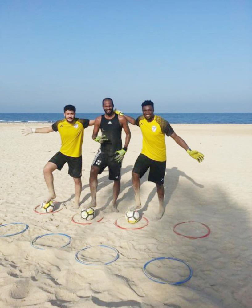 حراس المرمى خلال أداء تدريباتهم على أحد شواطئ جدة.