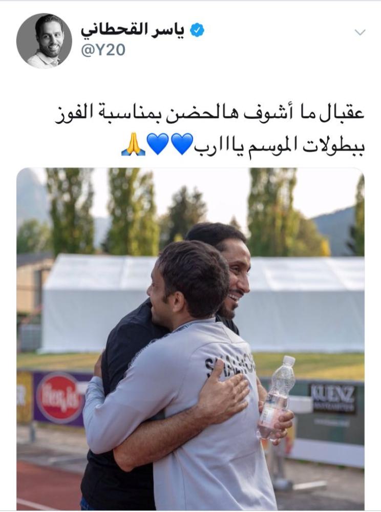 بعد زيارة رئيس نادي الهلال سامي الجابر لمعسكر الفريق الهلالي المقام حالياً في النمسا، وضع لاعب الهلال وقائده المعتزل حديثاً ياسر القحطاني عبر حسابه الخاص على «تويتر» صورة لرئيس النادي سامي الجابر وهو يحتضن القائد الهلالي محمد الشلهوب عند وصوله للمعسكر، وعلق عليها قائلاً: «عقبال ما أشوف هالحضن بمناسبة الفوز ببطولات الموسم يااارب».