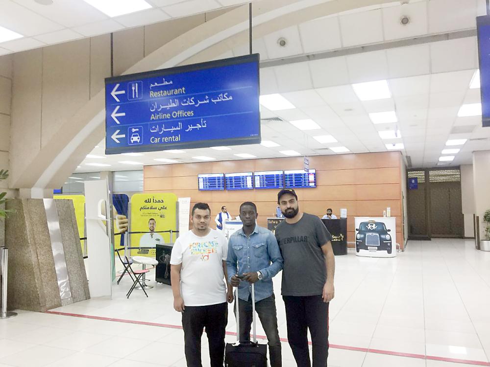 كاينا يتوسط وكيل أعماله صبري والزميل مصباح معتوق في مطار جدة.