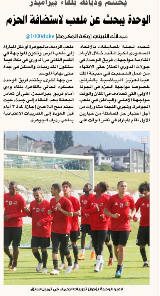 كما انفردت «عكاظ»، أبلغت لجنة المسابقات بالاتحاد السعودي لكرة القدم نادي الوحدة بنقل أول مواجهة أمام الحزم يوم الخميس 30 أغسطس إلى القصيم على ملعب الحزم بدلا من ملعب مدينة الملك عبدالعزيز الرياضية بالشرائع، الذي يخضع إلى تحديثات في كافة المرافق.