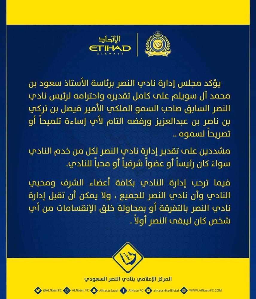 وأكد البيان أن مجلس إدارة النادي برئاسة سعود آل سويلم يحمل كل تقدير واحترام للأمير فيصل بن تركي، ولكل من خدم النادي، سواء رئيسا، أو عضو شرف، أو محبا للنادي.