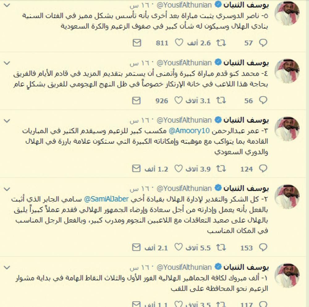 جاء ذلك خلال سلسلة من التغريدات بثها عبر حسابه الرسمي في موقع التواصل الاجتماعي تويتر، قائلا: «من الطريقة التي لعب بها المدرب مباراة اليوم أعتقد أن الفريق الذي يفكر بفتح اللعب أمام الهلال سيدفع الثمن بـالـ3 والـ4، باختصار «ياويييييله» اللي يفكر يهاجم الهلال».