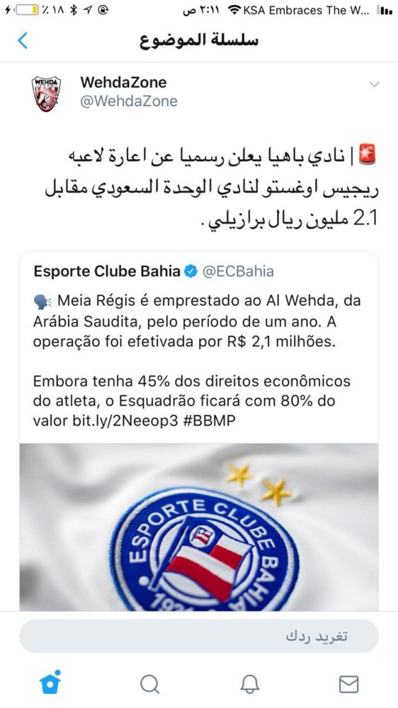 على الرغم من مضي 12 يوما على إقفال فترة التسجيل الصيفية محليا، إلا أن نادي باهيا البرازيلي رضخ أخيرا أمام تلويح نادي الوحدة بتصعيد القضية للاتحاد الدولي لكرة القدم (فيفا) بعد إعلانه قبل قليل عبر حساب النادي الرسمي بموقع التواصل الاجتماعي «تويتر» انتقال مهاجمه ريجيس أوغستو لصفوف الوحدة السعودي مقابل (2.1) مليون ريال برازيلي.