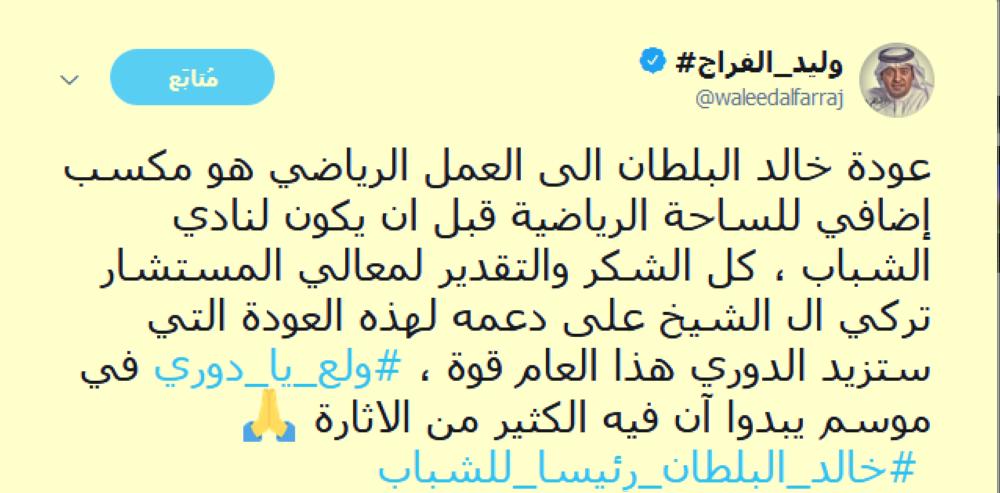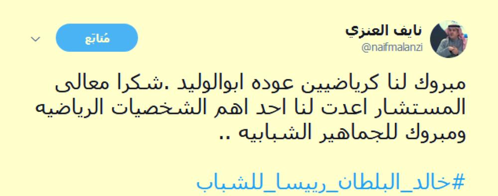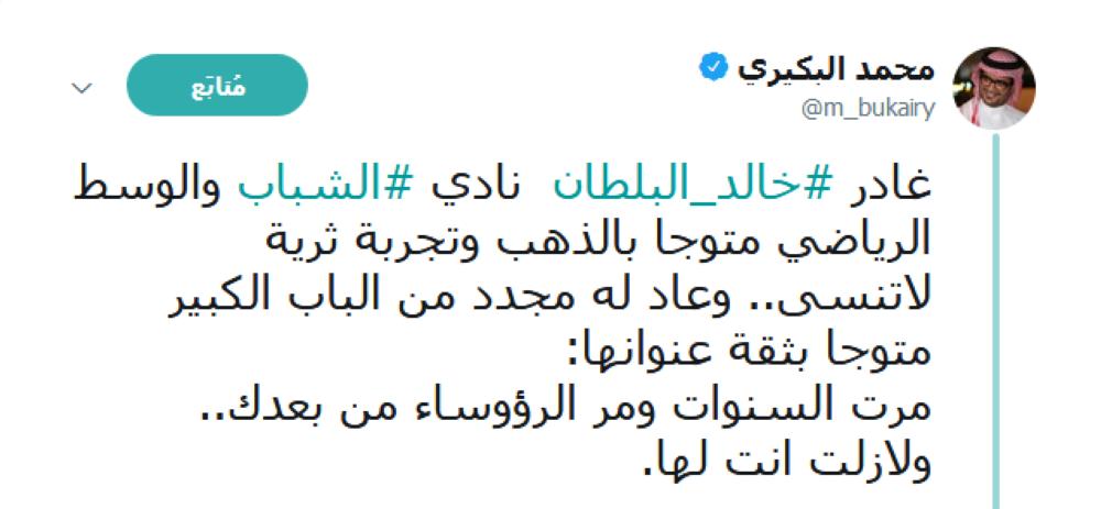 هاشتاق «خالد_البلطان_رئيسا_للشباب» يتصدر.. ومغردون: أنت لها