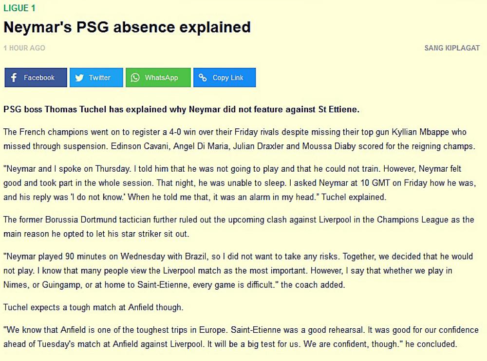 وتأكيداً لذلك صادق الألماني المدير الفني للفريق الأول لكرة القدم بنادي «PSG» توماس توخل الذي قال: نيمار «لم ينم» بشكل جيد في ليلة المباراة، إذ دار حديث بيني وبينه حول جاهزيته للمباراة والذي عادة ما يقول لي «أنا جاهز وأريد أن ألعب»، لكن أثناء الحديث أجاب بصورة مفاجئة، حيث قال: لا أعرف.