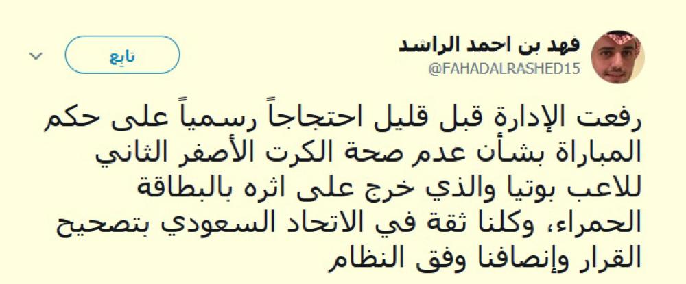 رفعت الإدارة احتجاجاً رسمياً على حكم المباراة، بشأن عدم صحة الكرت الأصفر الثاني للاعب بوتيا والذي خرج على إثره بالبطاقة الحمراء، وكلنا ثقة في الاتحاد السعودي بتصحيح القرار وإنصافنا وفق النظام، يذكر أن بوتيا ثاني لاعب هلالي يتعرض للطرد في مواجهات الفريق الهلالي الثانية، عقب طرد سالم الدوسري في مواجهة الهلال الافتتاحية أمام الفيحاء.