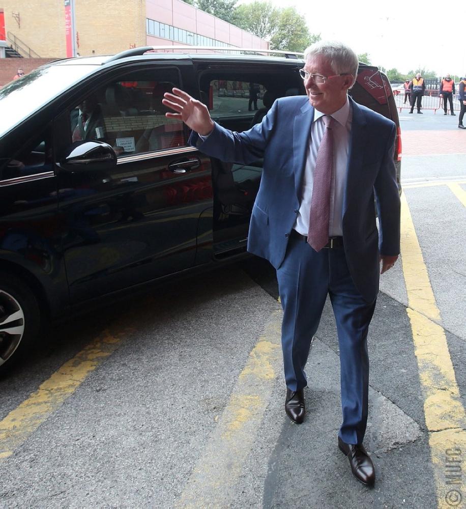 ونشر نادي «الشياطين الحمر» عبر حسابه على موقع «تويتر»، صورة لفيرغسون (76 عاما) باسما وهو يرتدي بزة رسمية زرقاء اللون، لدى وصوله إلى الباحة الخارجية للملعب.