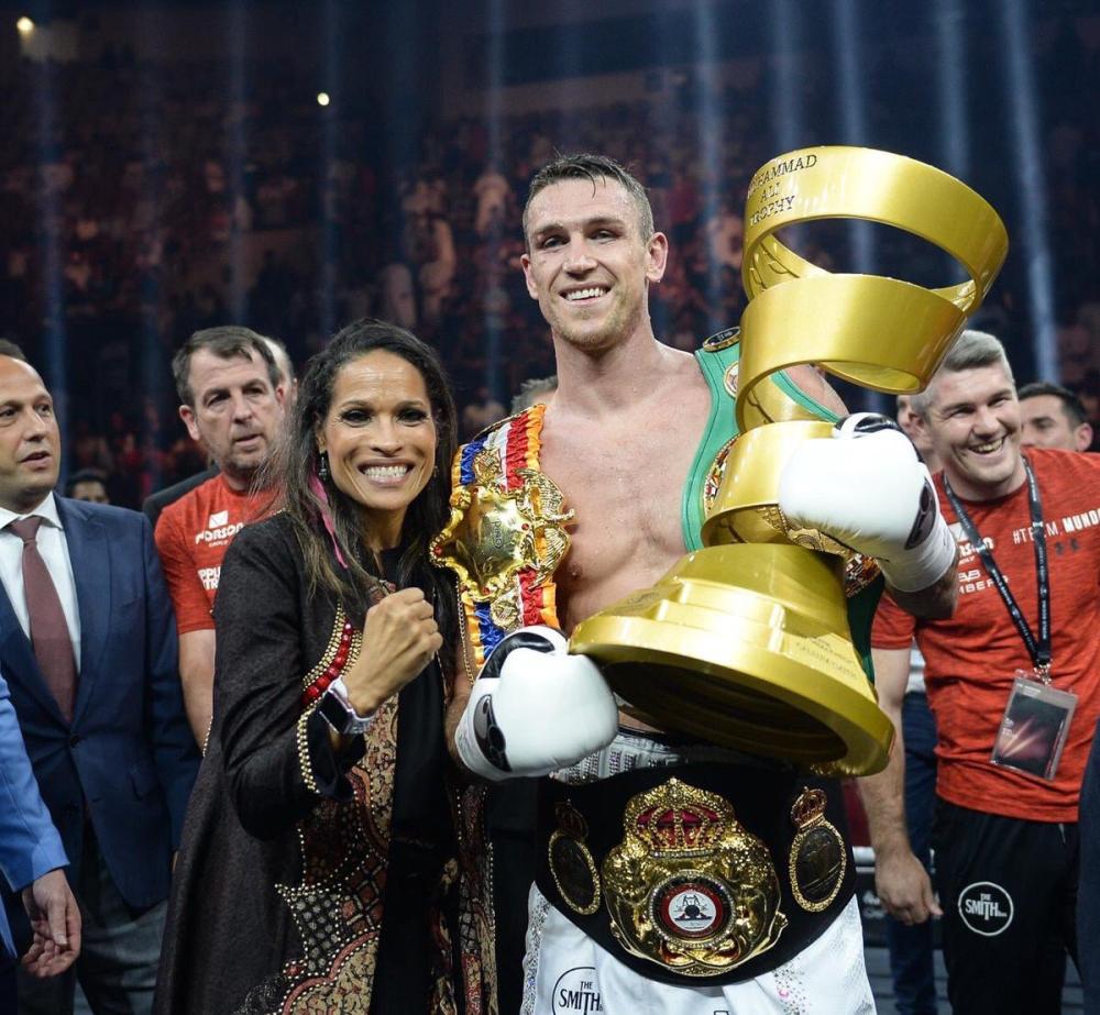 توج الملاكم البريطاني كالم سميث بلقب السوبر العالمي على كأس محمد علي للملاكمة، بعد فوزه في المباراة النهائية التي جمعته بمواطنه جورج جروفس اليوم بالصالة الرياضية بمدينة الملك عبدالله الرياضية بجدة، وذلك في الحدث العالمي الكبير الذي نظمته الهيئة العامة للرياضة، وفقًا للاتفاقية التي وقعها رئيس مجلس إدارة الهيئة العامة للرياضة تركي بن عبدالمحسن آل الشيخ مع شركة «كوموسا» المنظمة للبطولة، ضمن حزمة من الاتفاقيات التي وقعها في العاصمة البريطانية لندن العام الماضي.
