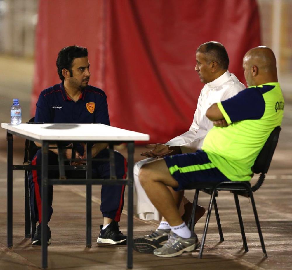 رئيس النادي مساعد الزامل خلال حديثه مع المشرف على الفريق محمد الصالح ومساعد المدرب عبدالعزيز البيشي