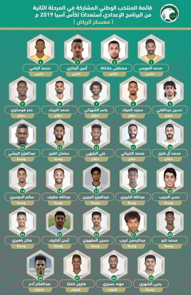 أعلنت إدارة المنتخب الوطني الأول قائمة الأسماء المختارة من المدير الفني خوان أنطونيو بيتزي للمشاركة في المعسكر الإعدادي الذي سيقام في العاصمة الرياض وينطلق يوم الأحد القادم ويستمر حتى الخامس عشر من أكتوبر الجاري، وذلك ضمن المرحلة الثانية من البرنامج الإعدادي للمشاركة في كأس آسيا 2019 التي ستقام في الإمارات خلال يناير القادم.